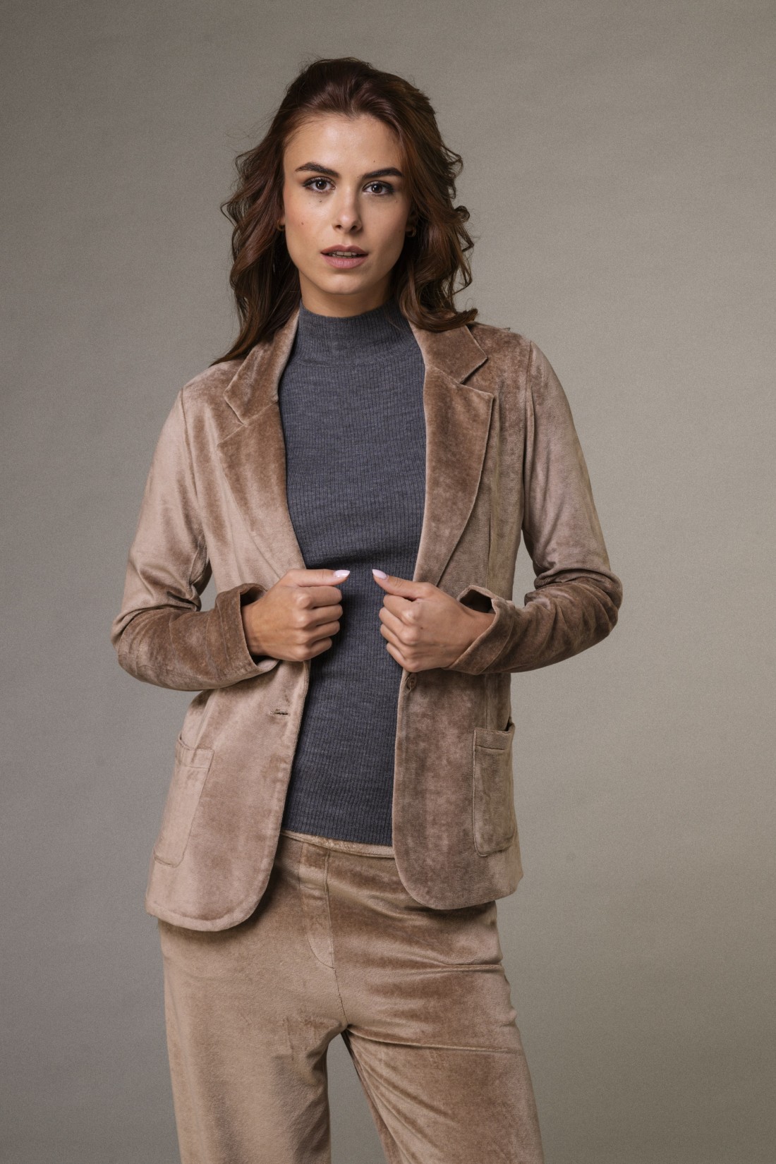 Giacca con manica lunga, colletto e tasche applicate: un capo versatile e femminile a vestibilità slim. La composizione di cotone, modal ed elastan la rende particolarmente avvolgente e morbida al tatto, con finish vellutato.