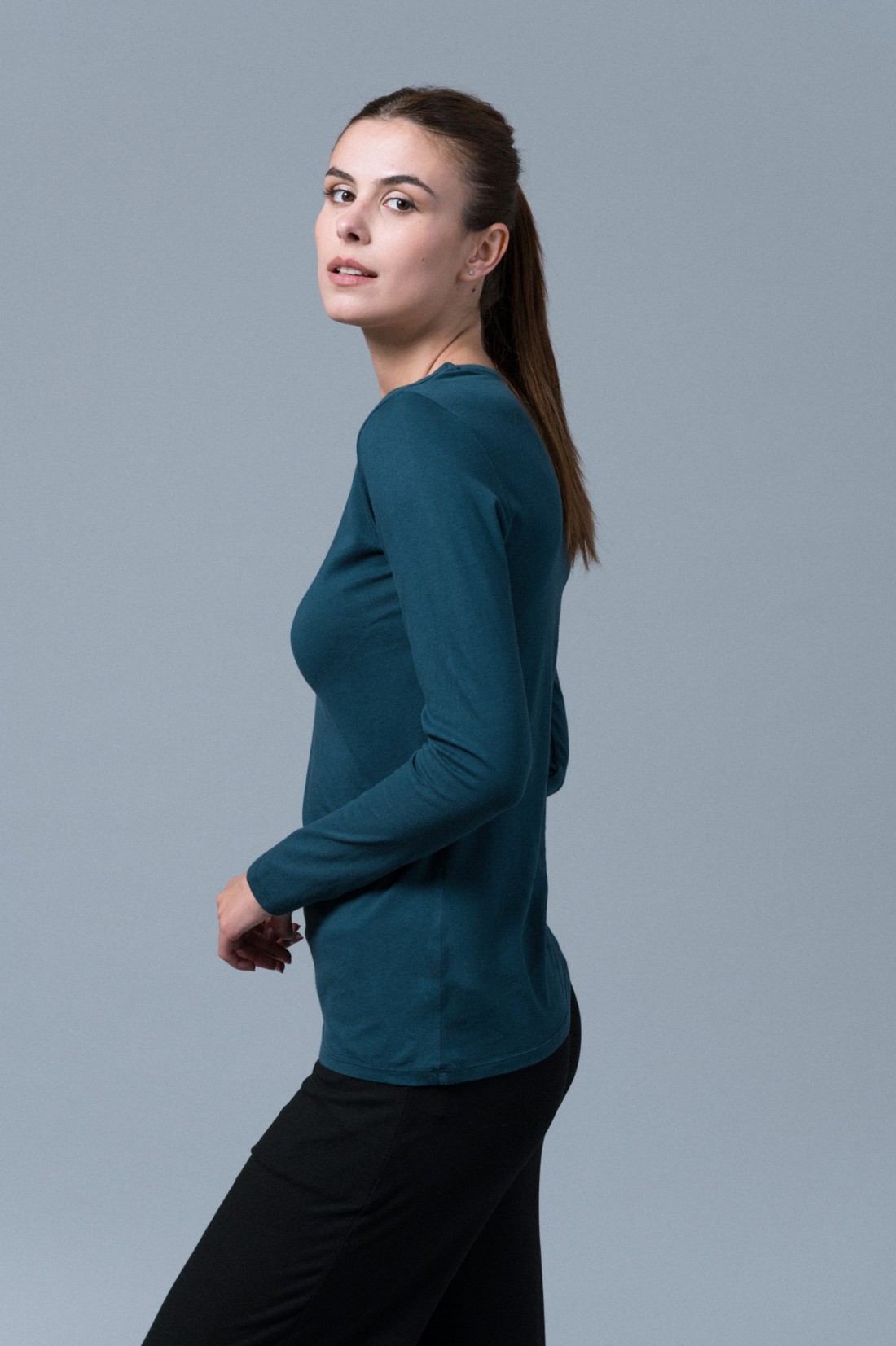 T-shirt basica girocollo in 100% Cotone Deluxe con manica lunga e vestibilità slim: un capo passepartout semplice e versatile. La composizione in Cotone Deluxe la rende confortevole e morbida al tatto, perfetta sia per look eleganti che per look essenziali.
