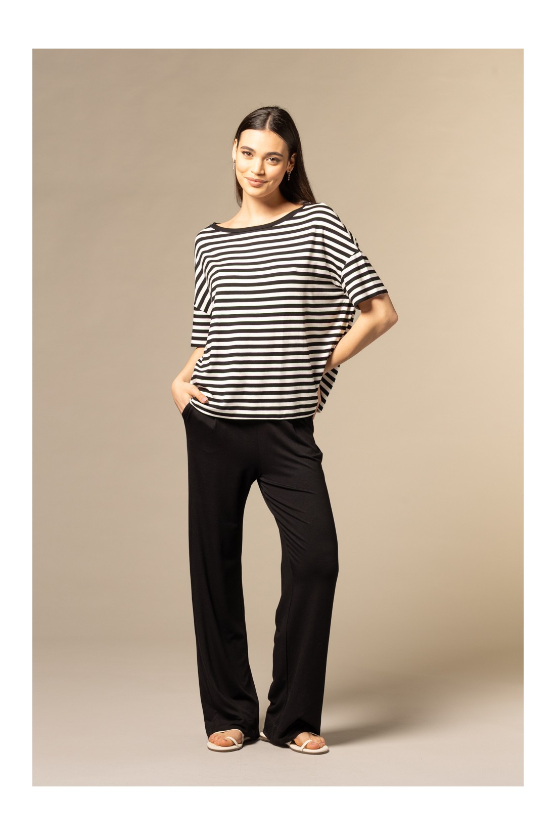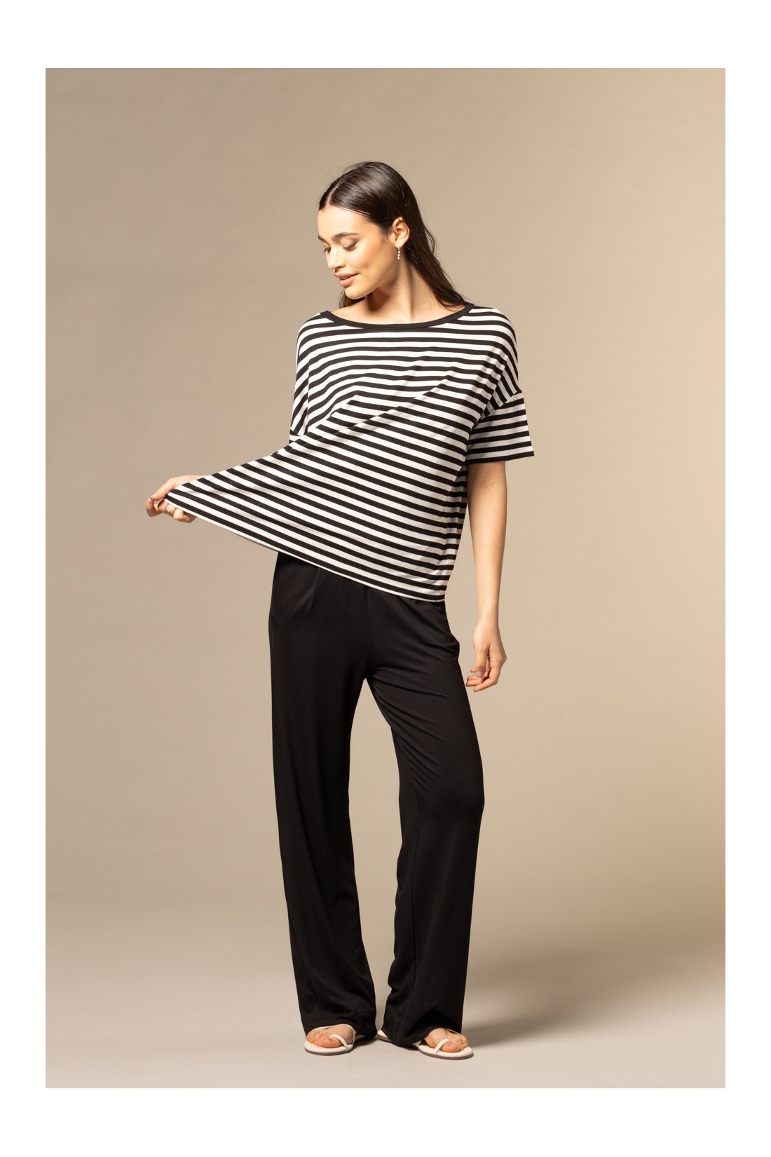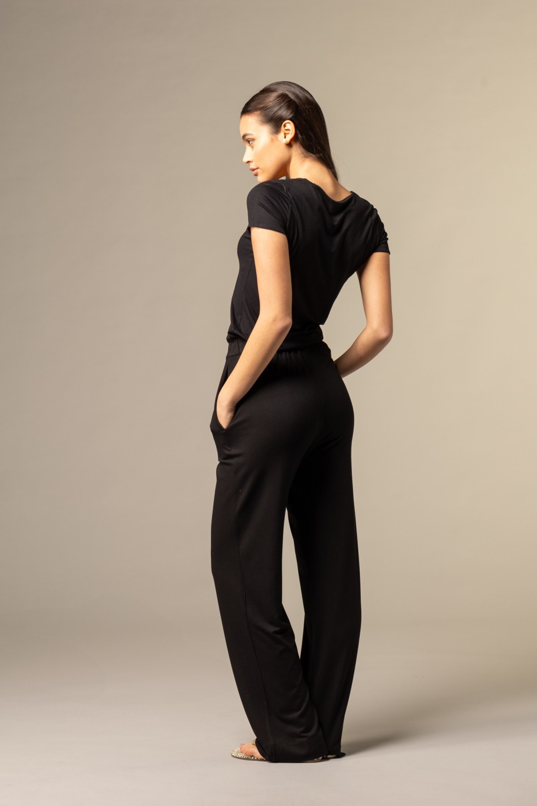 Pantalone nero con fondo ampio, pinces e vestibilità regolare: un capo pratico e moderno, perfetto per la vita di tutti i giorni. La composizione di viscosa ed elastan li rende particolarmente leggeri e morbidi al tatto.